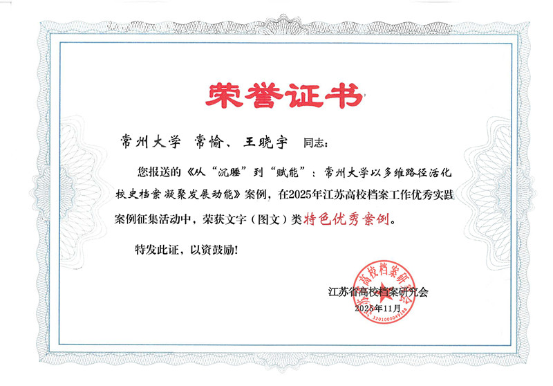 本次会议,公布了2025年江苏高校档案工作优秀实践案例评选结果,常州大学档案馆报送的《从“沉睡”到“赋能”:常州大学以多维路径活化校史档案 凝聚发展动能》荣获文字(图文)类特色优秀案例。该案例通过构建全方位的校史传播体系,将静态档案转化为可感知的文化载体,实现了校史文化从校内到校外、从阶段性到常态化的立体化传播,也彰显了常大档案馆在校史研究领域的积极探索和扎实成果。